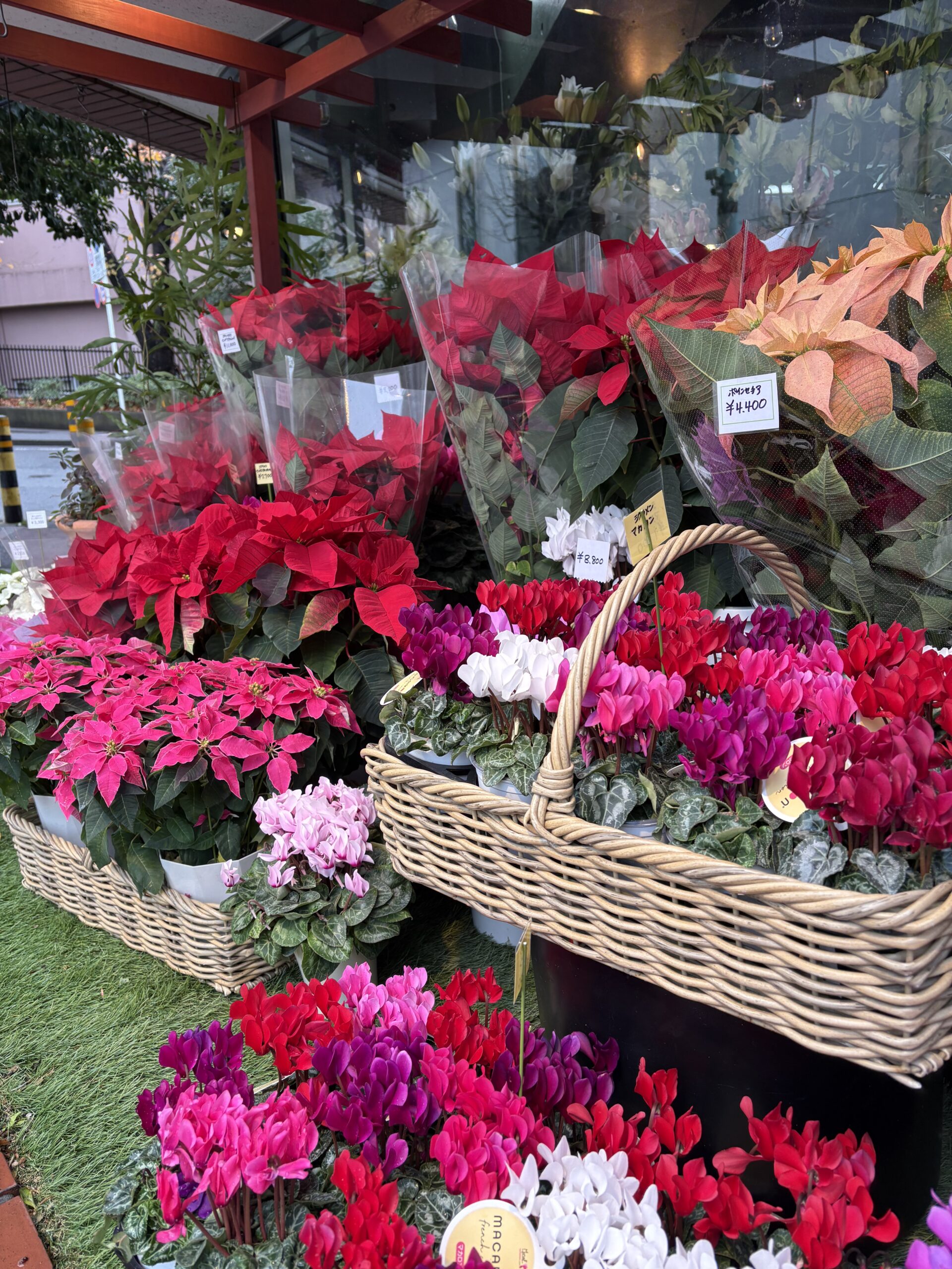 クリスマスに!オレゴンモミ枝、ポインセチア。冬の彩りに!華やかシクラメン。